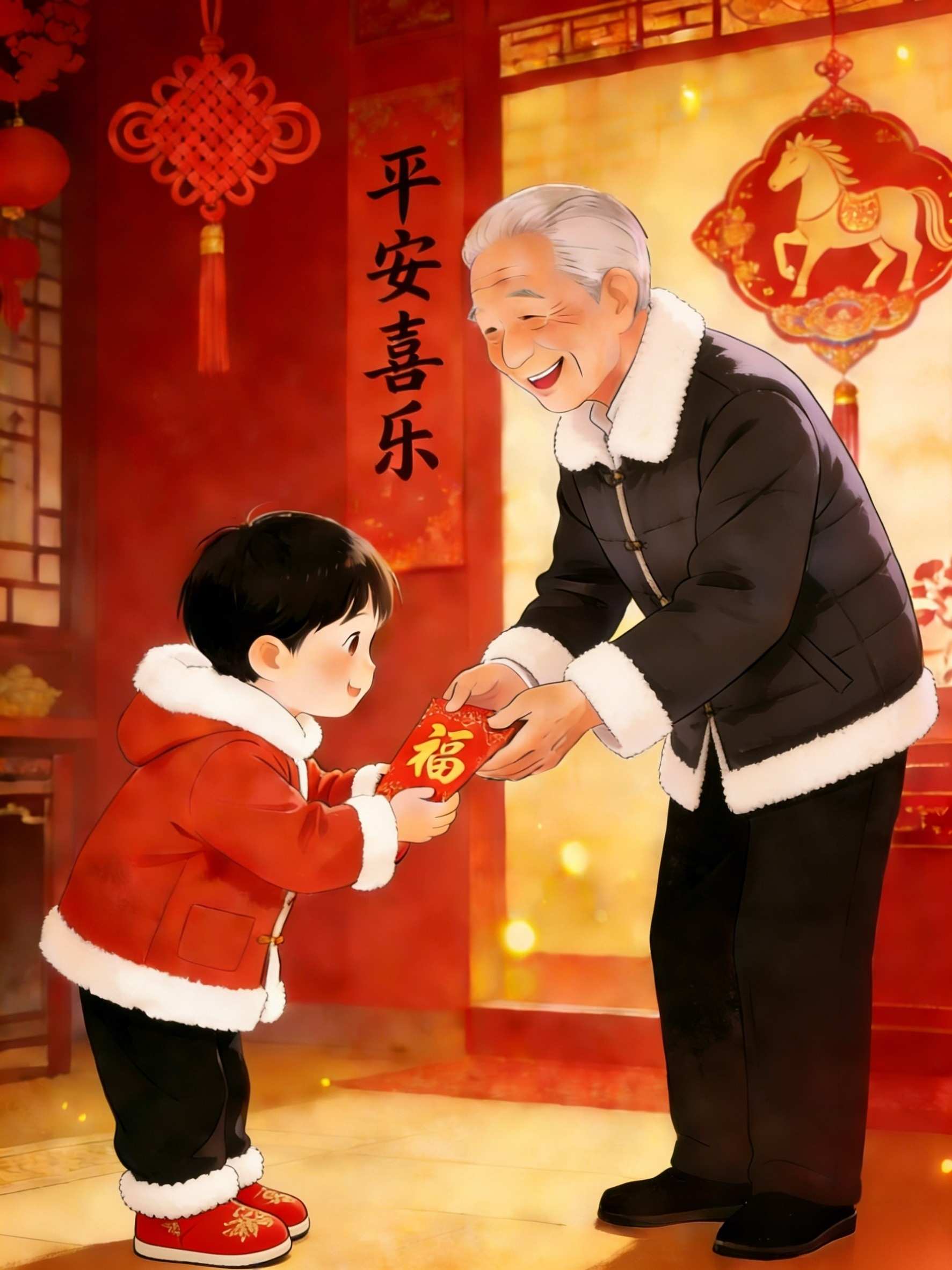 Durante o período de Ano Novo, as pessoas visitam seus familiares e amigos com palavras gentis e bênçãos. Eles dizem “Feliz Ano Novo” uns aos outros e desejam a todos saúde e felicidade. Os mais velhos darão envelopes vermelhos com dinheiro às crianças, aos mais novos, expressando esperanças amorosas pelo seu crescimento e bem-estar.