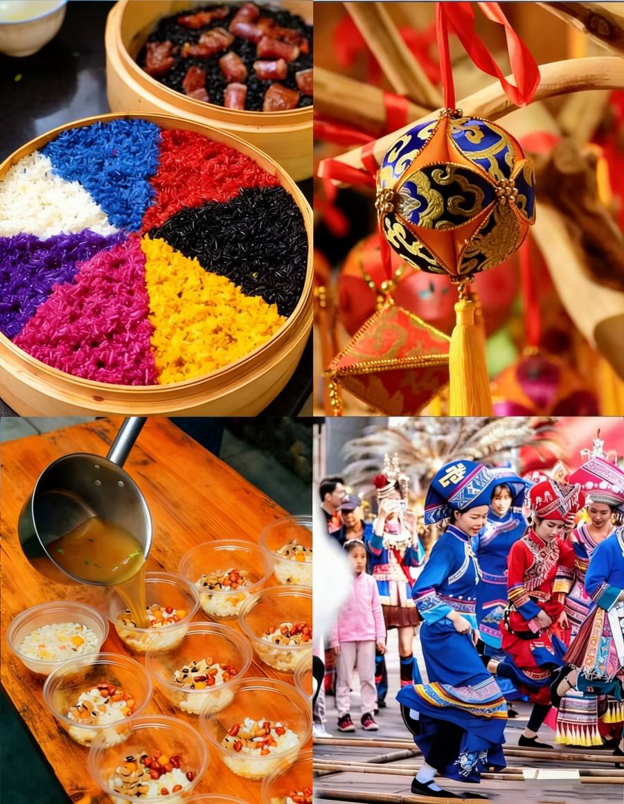 Além de cantar, as pessoas comemoram preparando arroz glutinoso de cinco cores tingido com sucos de plantas, jogando bolas bordadas, dançando varas de bambu e tocando tambores de bronze.